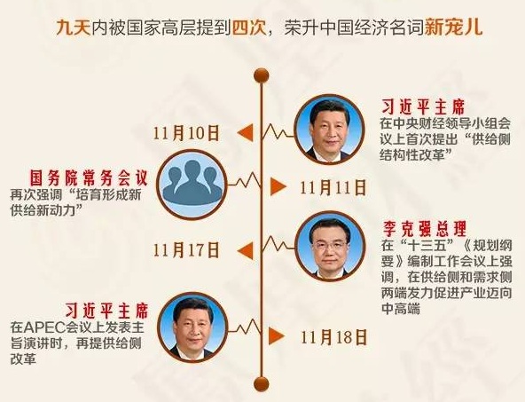 在2015年11月10日召开的中央财经领导小组第十一次会议上,习近平总书记提出了“供给侧结构性改革”概念:“在适度扩大总需求的同时,着力加强供给侧结构性改革,着力提高供给体系质量和效率,增强经济持续增长动力。”