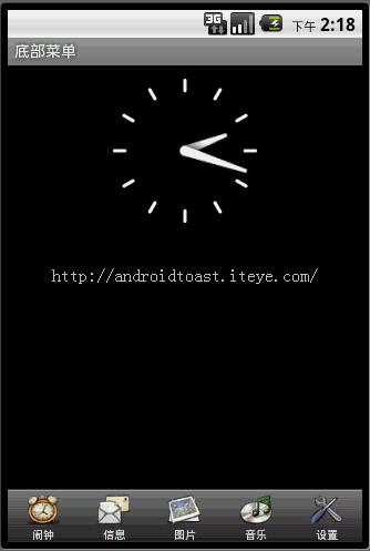 android底部菜单应用 Posted on 2016/10/24 21:07:15 Android By 王佳亮 在android中实现菜单功能有多种方法。 Options Menu:用户按下menu Button时显示的菜单。 Context Menu:用户长时间按下屏幕,所显示出来的菜单也称为上下文菜单。 Submenu:子菜单。 但是有时候这些内置的菜单并不能满足我们功能,这就需要自己自定义一种菜单。接下来我说的这种就是通过TabHost与RadioGroup结合完成的菜单。这也是很常用的一种底部菜单做法。先上图: