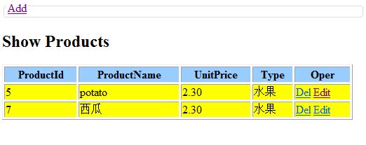 <%@ Page Language="C#" Inherits="System.Web.Mvc.ViewPage<Mvc1.Models.BaseList>" %> <%@Import Namespace="Mvc1.Models" %> <!DOCTYPE html PUBLIC "-//W3C//DTD XHTML 1.0 Transitional//EN" "http://www.w3.org/TR/xhtml1/DTD/xhtml1-transitional.dtd"> <html xmlns="http://www.w3.org/1999/xhtml" > <head runat="server"> <title>Index</title> <style type="text/css"> .style1 { background-color: #99CCFF; } .style2 { background-color: #FFFF00; } </style> </head> <body> <div> <fieldset> <legend> <a href="/Product/Create">Add</a> </legend> </fieldset> <h2>Show Products</h2> <table width="500" border="1"> <tr> <th class="style1">ProductId</th> <th class="style1">ProductName</th> <th class="style1">UnitPrice</th> <th class="style1">Type</th> <th class="style1">Oper</th> </tr> <% foreach (ProductInfo prod in Model.Prods) { %> <tr> <td class="style2"><%=prod.ProductId%></td> <td class="style2"><%=prod.ProductName%></td> <td class="style2"><%=prod.UnitPrice%></td> <td class="style2"><%=prod.Type%></td> <td class="style2"> <a href="<%=string.Format("/Product/Delete/{0}",prod.ProductId) %>">Del</a> <a href="<%=string.Format("/Product/Edit/{0}",prod.ProductId) %>">Edit</a> </td> </tr> <%} %> </table> </div> </body> </html>