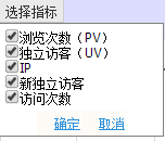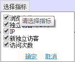 <div class="select_checkBox"> <div class="chartQuota"> <p> <a href="javascript:;" hidefocus="true" title="请选择指标"><span>选择指标</span> <b></b> </a> </p> </div><br> <div class="chartOptionsFlowTrend""> <ul> <li class=""><input type="checkbox" value="1"><span>浏览次数(PV)</span> </li> <li class=""><input type="checkbox" value="1"><span>独立访客(UV)</span> </li> <li class=""><input type="checkbox" value="1"><span>IP</span> </li> <li class=""><input type="checkbox" value="1"><span>新独立访客</span> </li> <li class=""><input type="checkbox" value="1"><span>访问次数</span> </li> </ul> <p> <a href="javascript:;" title="确定" hidefocus="true" class="a_0">确定</a><a href="javascript:;" title="取消" hidefocus="true" class="a_1">取消</a> </p> </div> </div>js: