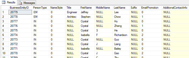 此外,在含有导航属性时,将一个对象赋值给另一个对象的导航属性也能达到添加的效果(当导航属性为”DbSet“集合时通过调用导航属性的 “Add()“方法也同样可以达到添加效果),例如在”Person.Person”中我们上面添加了两条记录,但对于“Person”类的导航属性 “EmailAddress”和“Password”在对应的“EmailAddress”表和“Password”表中并没有添加对应的记录,此时我们 就可以通过下面的方式来增加: