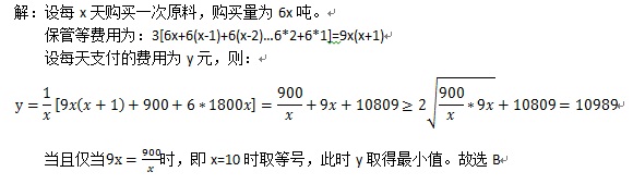 分享一道简单的管理决策问题 Posted on 2016/10/23 11:46:11 日常随笔 By 王佳亮 某工厂定期购买一种原料,已知该厂每天需用该原料6吨,每吨价格1800元,原料的保管费用平均每天每吨3元,每次购买原料需支付运费900元,若该厂要使平均每天支付的费用最省,则应该每()天购买一次原料。 A.11 B.10 C.9 D.8 E.7