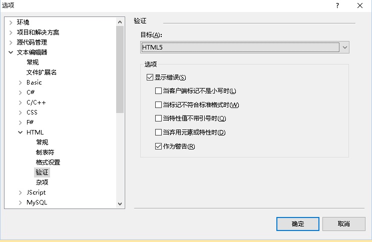 VISUAL STUDIO 改为HTML5验证 Posted on 2016/10/23 14:57:55 C# By 王佳亮 VISUAL STUDIO 2010在编写HTML格式的程序时,由于VISUAL STUDIO程序验证默认是XHTML 1.0 的语法格式。 使用HTML5的语法进行WEB编程时,总会报一些不必要的错误提示。 很不爽。 解决这个问题的办法是: 在VISUAL STUDIO 的 工具->选项->文本编辑器->HTML->验证->目标下选择HTML5 这样,就会以HTML5的语法格式来验证WEB程序了。