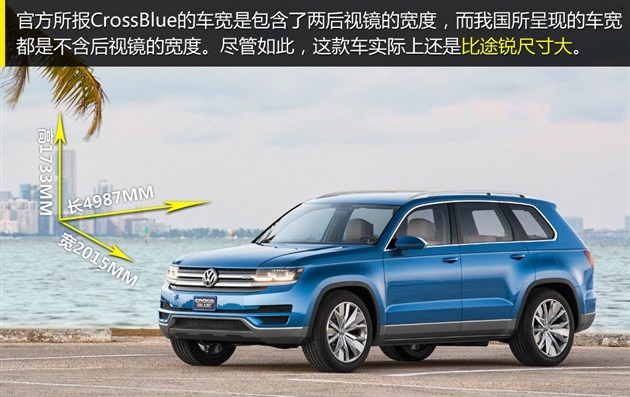 大众CrossBlue概念车的长宽高分别为4,986/2,014/1,732mm,尺寸大于常见中型SUV,超过丰田汉兰达、现代胜达等车型。