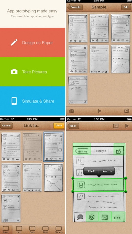 一款运行在IPad上的APP原型设计软件。是一个非常好的、免费的HTML5应用,通过它可以创建可爱朴素的线框图、实体模型和UI概念。该程序使用起来非常简单,并且有内置的模板可以直接使用(模板包括单选按钮、链接、图像占位符、文本框以及滑块等)。