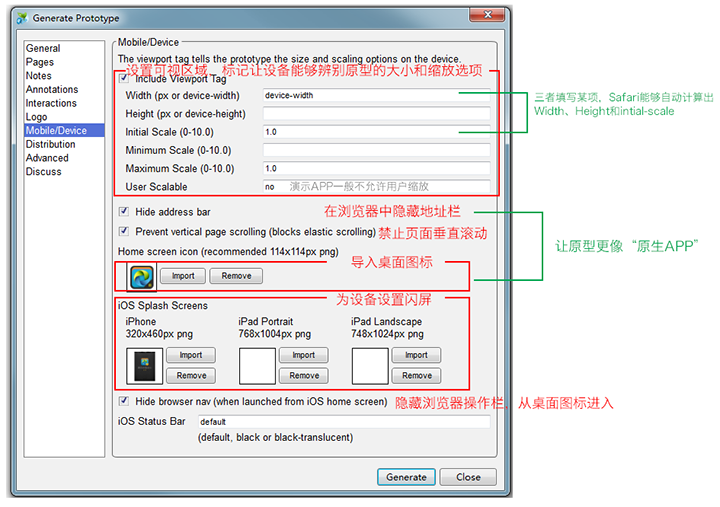 Axure大家应该都不陌生。这里主要说下移动端的演示,这样才充分表达原型意图。按F5生成原型的时候,在“Mobile/Device”选项中可以设置适配移动设备 的特殊原型(Axure 6.5以下版本),再用移动设备访问你生成的原型链接即可(该页面创建一个桌面快捷方式)。
