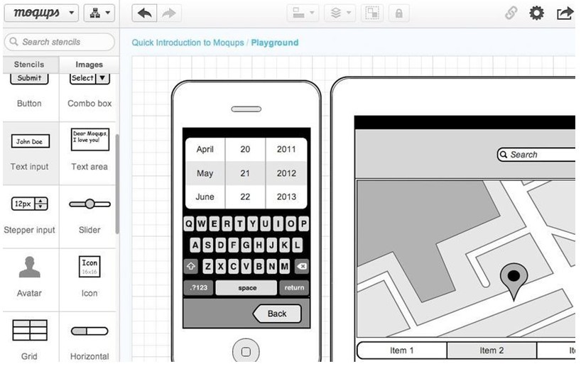 它还提供了iPhone和iPad模板,以及iOS相关的按钮、提示框、picker、菜单、开关以及键盘等。你可以设置网格的尺寸,并预览和分享你的线框图。Moqups提供了一个很有用的功能就是对齐网格,可以使对象精准对齐。