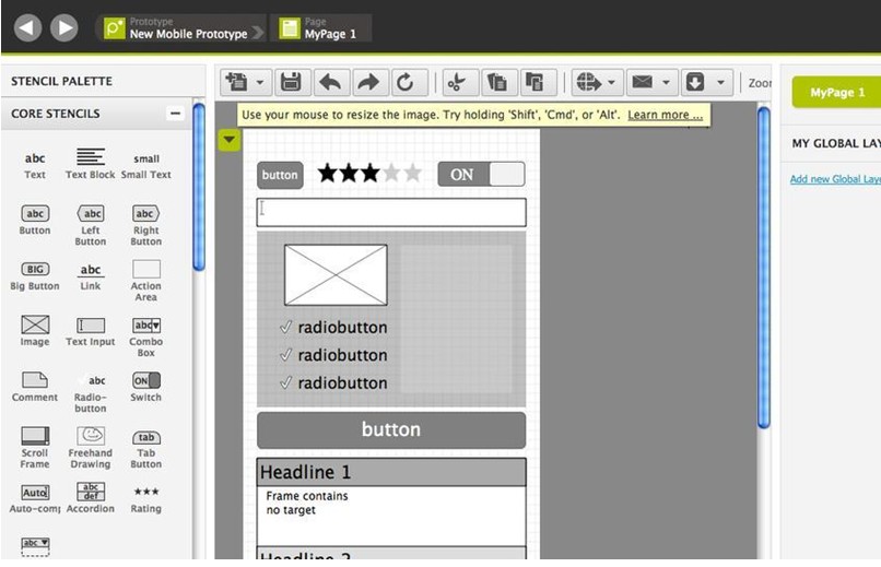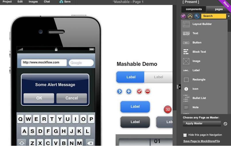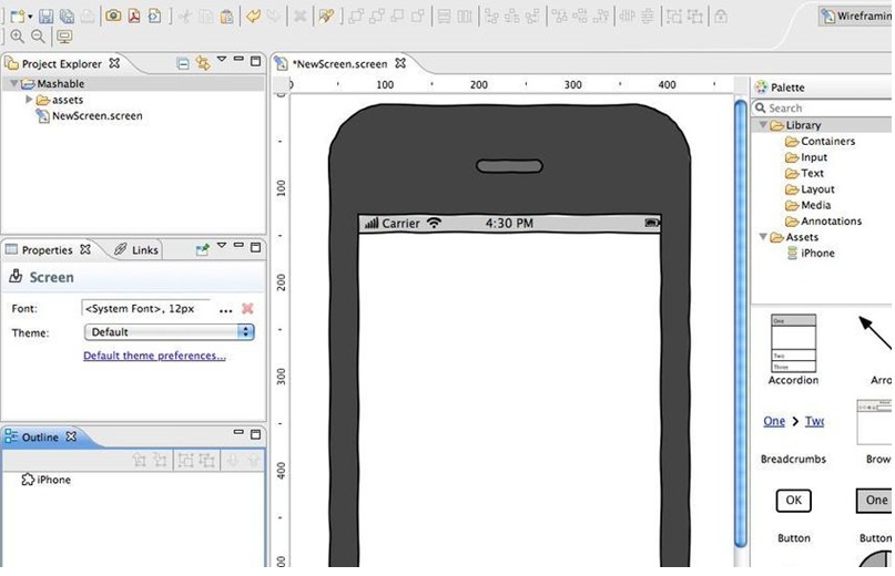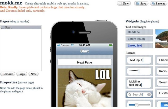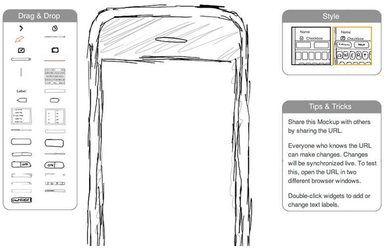 是一个非常好的、免费的HTML5应用,通过它可以创建可爱朴素的线框图、实体模型和UI概念。该程序使用起来非常简单,并且有内置的模板可以直接使用(模板包括单选按钮、链接、图像占位符、文本框以及滑块等)。