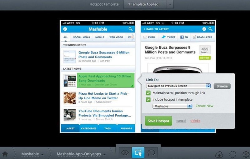 作 为一个强大的线框图和原型平台,Protoshare提供了大量移动工具集(有来自中心资源库的大量移动模版和大量2D、3D动画过渡)。通过“拖放”界 面,你可以快速创建交互式的线框图和移动原型,然后发送至iPhone、iPad或者Android设备进行测试,体验app的功能实现情况。