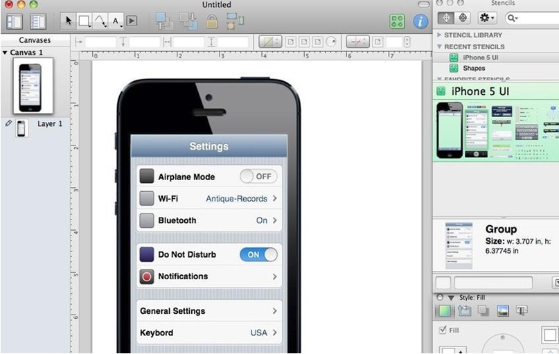 它采用拖放的所见即所得界面,你可以用钢笔工具绘制自定义的模版或者图形,此外还自带Graffletopia提供的多个iPhone、iPad以及Android模版。