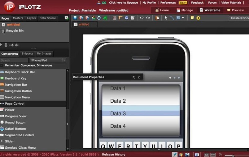 iPlotz 是一款可以用来创建可点击、可导航的原型和线框图工具,适合网站开发者和移动app开发者。你可以在一个可调整的页面拖放元件,然后连接起来,增加其他屏 幕或者页面的热点链接。你可以选择使用iPhone/iPad模版或者Android模版,任何模版都有独一无二的元件设置。