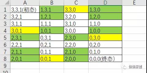 2、不可能存在的状态,用黄色标出。例如:船不可能停在没有人的岸边【0,0,1】,以及美女不可能在野人占多数的情况下,划船到对岸【3,0,1】。