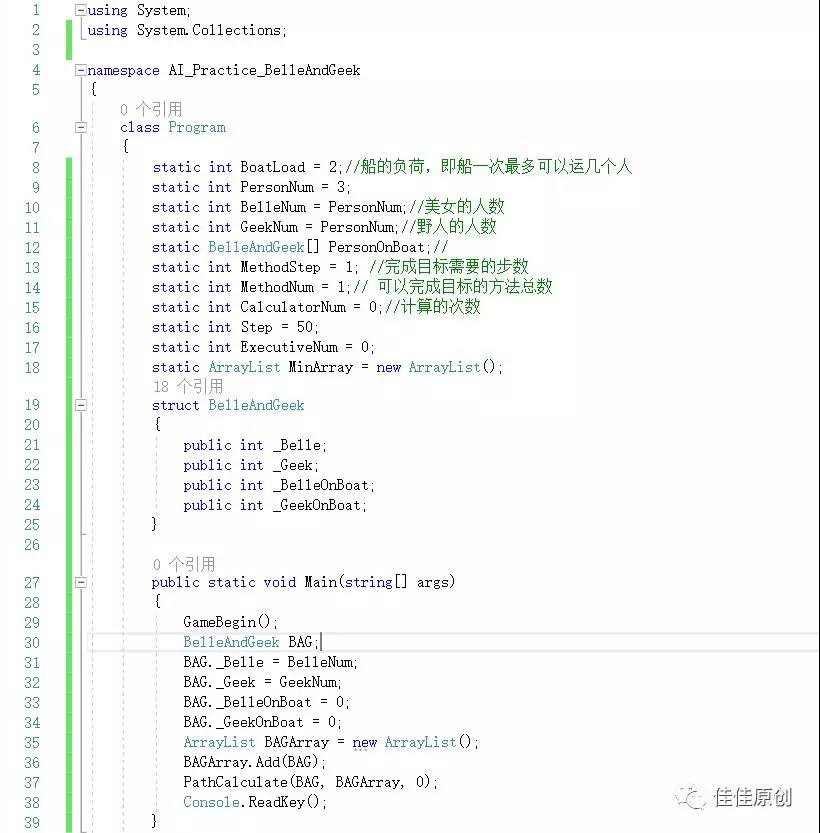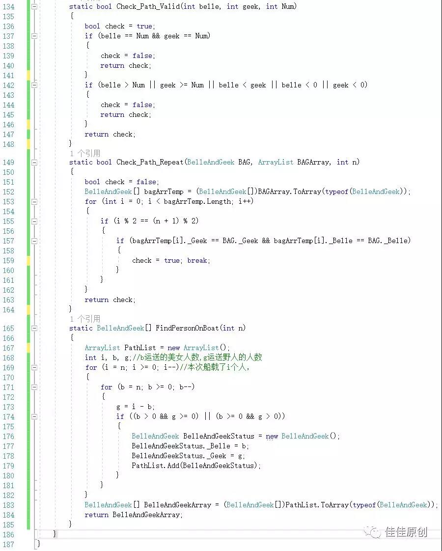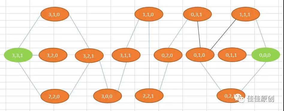 1、野人人数大于美女人数的状态,用绿色标出。不符合条件。因为按照题目要求,河的左岸和右岸上,野人人数大于美女人数,美女会被吃掉,任务失败。这里不仅要考虑左岸的情况,也要考虑右岸的,例如:【2,0,1】,这就很明显,船在左岸的时候,右岸有1个(3减2)美女和3个(3减0)野人,也是不满足题目要求的。