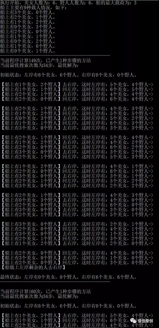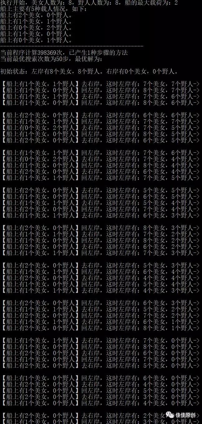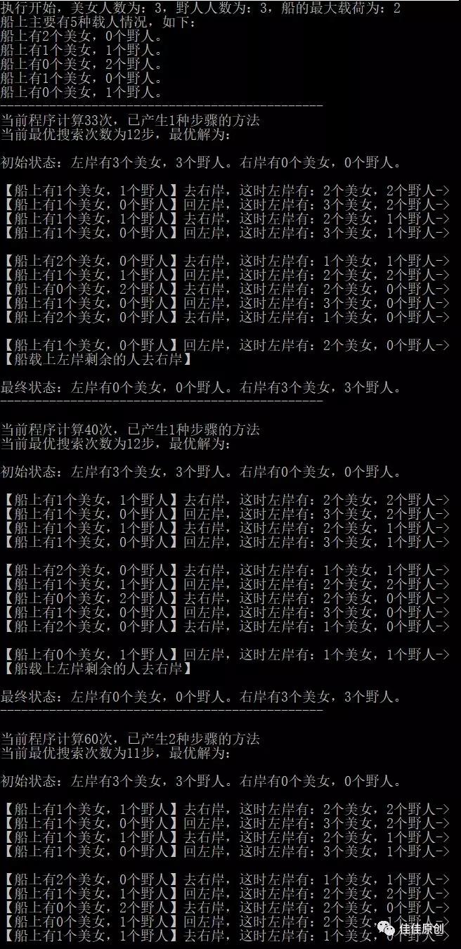代码执行结果,我们可以看到,安全过河的方法有好几种。如下图4-2 算法执行结果所示。