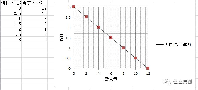 我们再直观地讲一下这个需求曲线,假如你早上吃馒头,如果免费吃,你愿意吃12个,当馒头0.5元一个时,你愿意吃10个,当馒头1元一个时,你愿意吃8个,依次类推,当馒头价格是3元时,你宁愿选择不吃,就是0个。如下图所示。