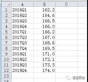 继续看一个实际工作中的案例。这次的案例更加细节一些,上升到实际操作层面。假如你是一位负责的某个投资类型的产品是消费品领域,准备对澳大利亚的消费品领域进行投资,假设准备投资的消费品领域的收益同澳大利亚本国的CPI(Consumer Price Index,居民消费价格指数)正相关。同时我们有近三年的一组CPI数据,如下图所示。