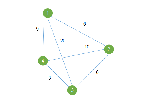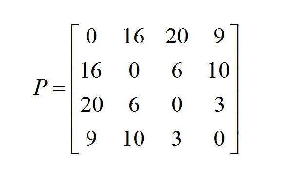 上图便列出了派送员可去派送目标点的所有路径。我们如何来描述呢?这就用到了大学时数学中的矩阵。我们定义一个矩阵:P[i][j],如果一个点i到j有边,则 P[i][j]=<i,j>。例如:从图中的点1到点2,距离是16,则有边;而点1到点1,我们认为是没有边的,则为0。按照这个逻辑,我们生成矩阵如下图3-3 路径的矩阵表示所示: