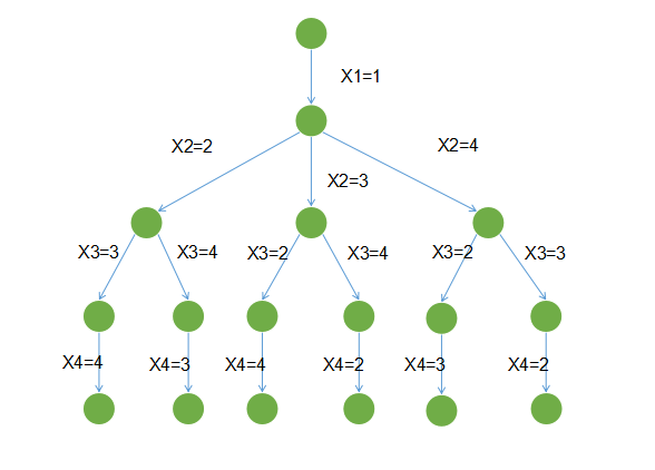 我们接下来要实现的就是派送员怎么走,路径最优。我们要把这个计算逻辑写到PRD中,这样开发工程师就可以根据我们定义的逻辑,实现AI智能调度中的最优派送路径,系统就可以对派送员的派送路线进行最优规划。从之前的由人来调度,实现了机器智能调度。不仅速度快,还比人工计划外送员的派送路径更优。我们可以将派送员的派送路径,看作是一个n元组。我们的实战中的情况,所以步骤可以表示为:{X1,X2,X3,X4}。如果我们把这个转化成一棵排列树,如下图3-2 派送路径树所示。