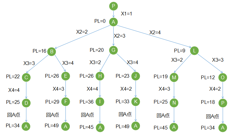 - STEP8:从结点E(派送点4)这时满足条件的只有到派送点3,然后从派送点3回出发点1。因此:PL+P[4][3]=26+3=29,PL值更新为29,即PL=29,有效,因些生成结点F。