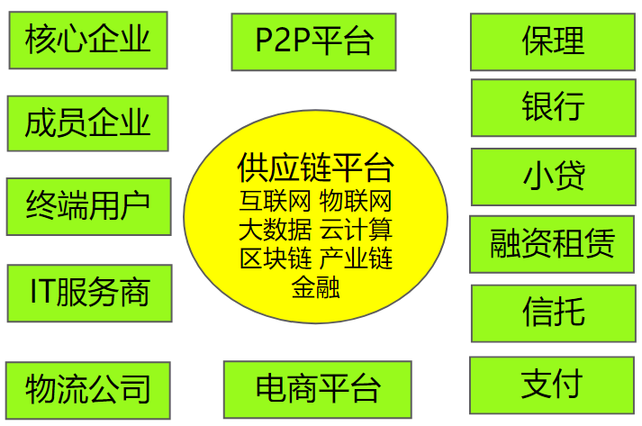 我们先理解一下什么是供应链。根据我们大学时供应链管理课本中,对于供应链的定义是以核心企业为中心,通过掌控物流、信息流、资金流和商流,在采购、加工、制成产品到销售的过程中,供应商、制造商、分销商、零售商以及消费者构成整体性的功能网链结构模式。说到底其实就是上下游之间的一种供需关系。而这种供需必然涉及资金的交互。在企业财务管理中,资金周转率是一个很重要的财务指标,反应资金流转速度。而现实中的供应链,往往应收货款时间很长,像一些核心有话语权的企业,供应商和他合作,往往不是一手交钱一手交货,会导致供应商的资金周转率水平较低,资金利用率差。供应链金融的出现,正是解决供应链网链中各企业的资金痛点,提升企业的经营效率。现阶段,国内对于供应链金融还没有一个权威的定义。2005年瑞士圣加伦大学霍夫曼教授当时给出的供应链金融的定义是:供应链中包括外部服务提供者在内的两个以上的组织,通过计划、执行和控制金融资源在组织之间的流动,以共同创造价值的一种途径。而我们目前大多数人可能认为所谓的供应链金融其实就是组供应链中的企业融资。其实供应链金融远远不是融资这么简单。供应链金融的整体框架如下“图2-1 供应链金融整体框架”所示。