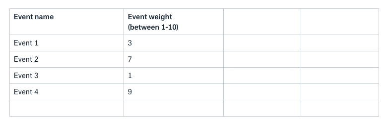 So you need to weigh these activities accordingly. Create a table that looks like the one below. List your engagement events on the left column and weigh each event on the right, like so: