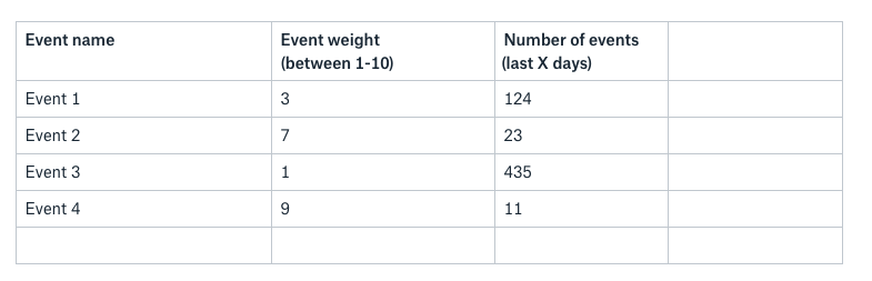 Then, for each one of your users, you should add a column for the number of times they triggered each event over a period of time (for example, the past seven days):