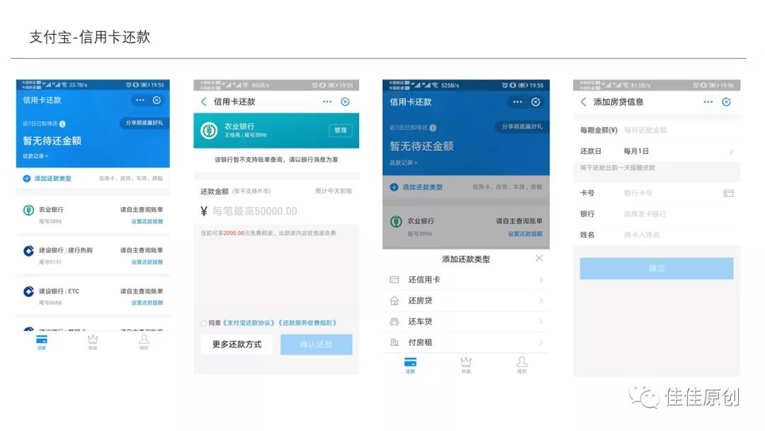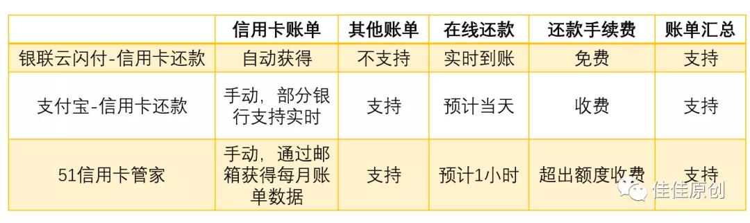 我们选取市面上比较主流产品的账单还款产品。分别是银联云闪付中的信用卡功能、支付宝中的信用卡功能和业界主打信用卡账单管理的“51信用卡管家”。