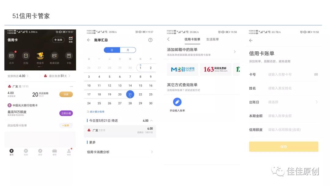 51信用卡算是在互联网行业主打以信用卡还款产品为核心的企业了。支持用户添加信用卡账单和生活账单,统计比较全面。账单汇总功能,可以查看名下各账单的还款情况,并为用户提供了信用卡消费分析。为客户提供了除账单管理的额外增值服务。对于51信用卡而言,其Slogan是“让有信用的人过得更好”,可见信用卡账单管理对用户来说功能是免费的,不是51信用卡营收的直接来源,但通过引流,最终通过发放贷款进行赚钱。