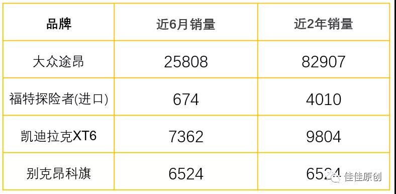 大家直观的感受是途昂的销量和市场占有率是高于昂科旗、福特探险者和凯迪拉克XT6的。主要是因为大众品牌在国内深耕多年,消费者对大众的品牌比较认可,同时途昂上市时间也早于其他几款车型国产后的上市时间,对市场占有率相对昂科旗、福特探险者和凯迪拉克XT6要高。