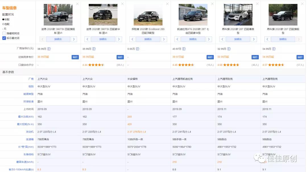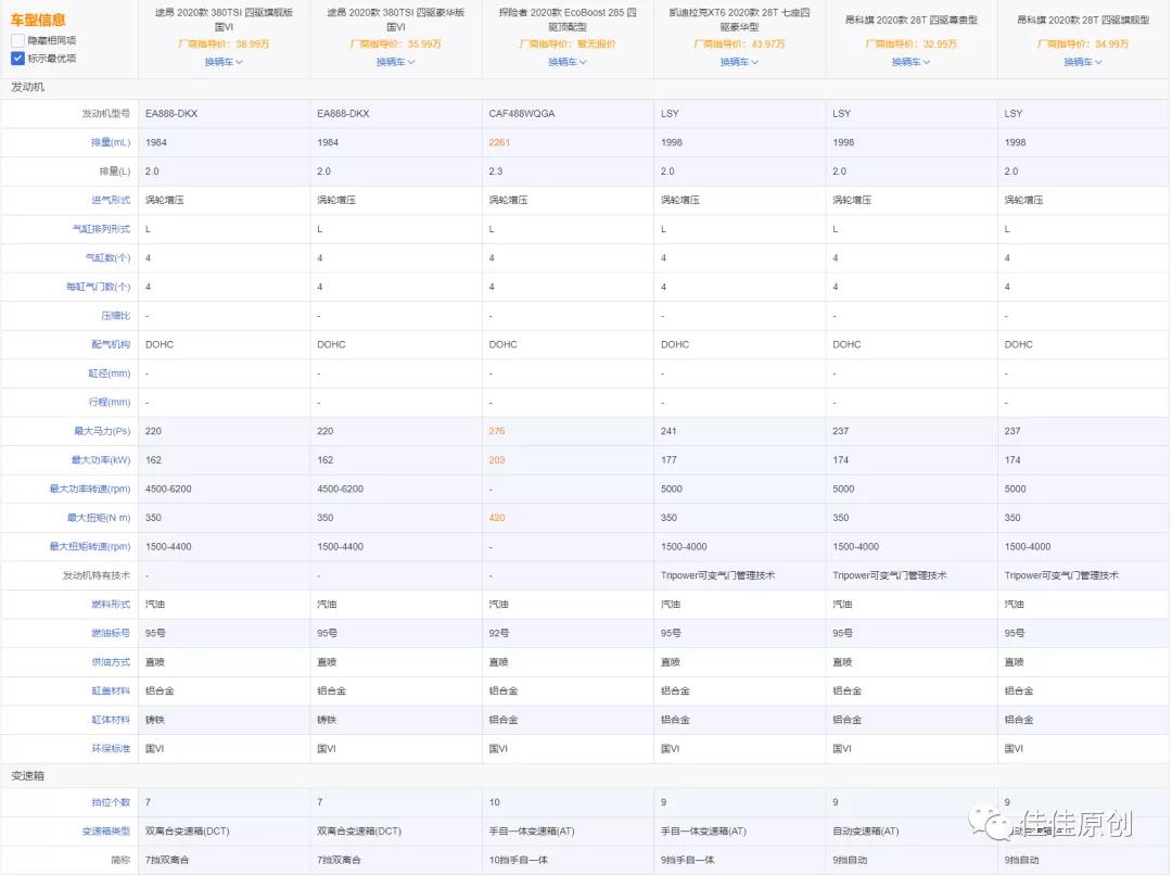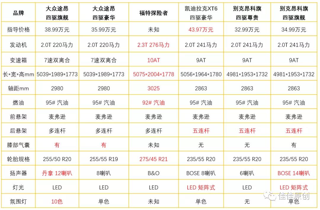 根据汽车厂商公布的数据,我们整理出这大众途昂、福特探险者、凯迪拉克XT6和别克昂科旗的几款车型主要的差异点如下表所示。优势参数用红色字体标出。