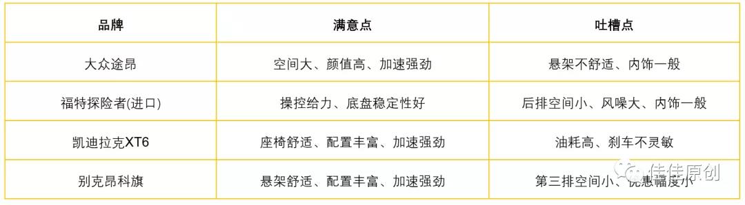 世上并没有完美的产品,汽车产品也一样。每个品牌的汽车多多少少都有消费者不满意的地方。经过分析整理,我们来看一下这几款汽车产品的口碑情况,如下表所示。
