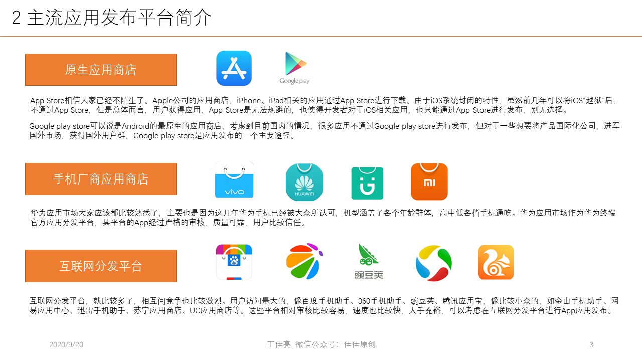 目前主流的手机操作系统主要有Apple公司的iOS和Google公司的Android。Apple iOS的相关应用,开发者通过App Store进行应用发布,供用户使用,Google Android的相关应用,开发者通过Google play store发布应用,供用户使用。所以,开发者一般仅需要注册两个应用商店的账号即可。而国内由于谷歌应用商店不能直接访问,对于Android操作系统的手机,更多的是各家手机厂商通过自己的应用市场为用户提供服务,除此之外,还有一些第三方的应用市场为Android系统用户提供服务。因此,对于国内开发者而言,面临的问题是,应用开发出来,要在不同的应用商店去发布应用,同时还要去看发布后的数据,选择之后在哪个应用商店发布应用更合适。也就意味着,对于Android应用发布,需要在多个平台上进行。对于一些大型的公司,会有专人来负责iOS和Android应用的发布,数据分析和管理。但是,对于一些小型团队,尤其是创业初期的团队,不大可能招一个专职的人员去管理应用发布,维护应用商店所发布应用的版本信息以及一些其他问题。产品经理作为产品的属主,往往会承担起这个应用商店发布App的“重任”。产品经理管理App应用商店的发布,一方面,可以看一下自己所负责产品上到应用商店的用户下载情况,也可以对用户的在应用商店中的反馈有一个直观的感觉,另一方面,发布的同时关注应用商店的同时,还可以顺便看一下竞品情况,获得更多产品数据,从而帮助改进产品,取长补短。对于产品经理而言,尤其是最初接触这块工作内容的产品经理,往往会有个困惑,目前市面上应用商店究竟有哪些?不同应用商店都需要什么审核材料?审核周期是多久?APP提交应用商店审核有哪些注意点?各家应用商店有哪些不同?面对这些问题,本文接下来将会以实战的方式进行解答。2、主流应用发布平台简介