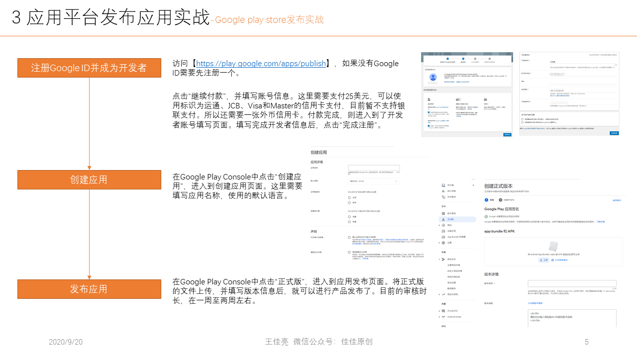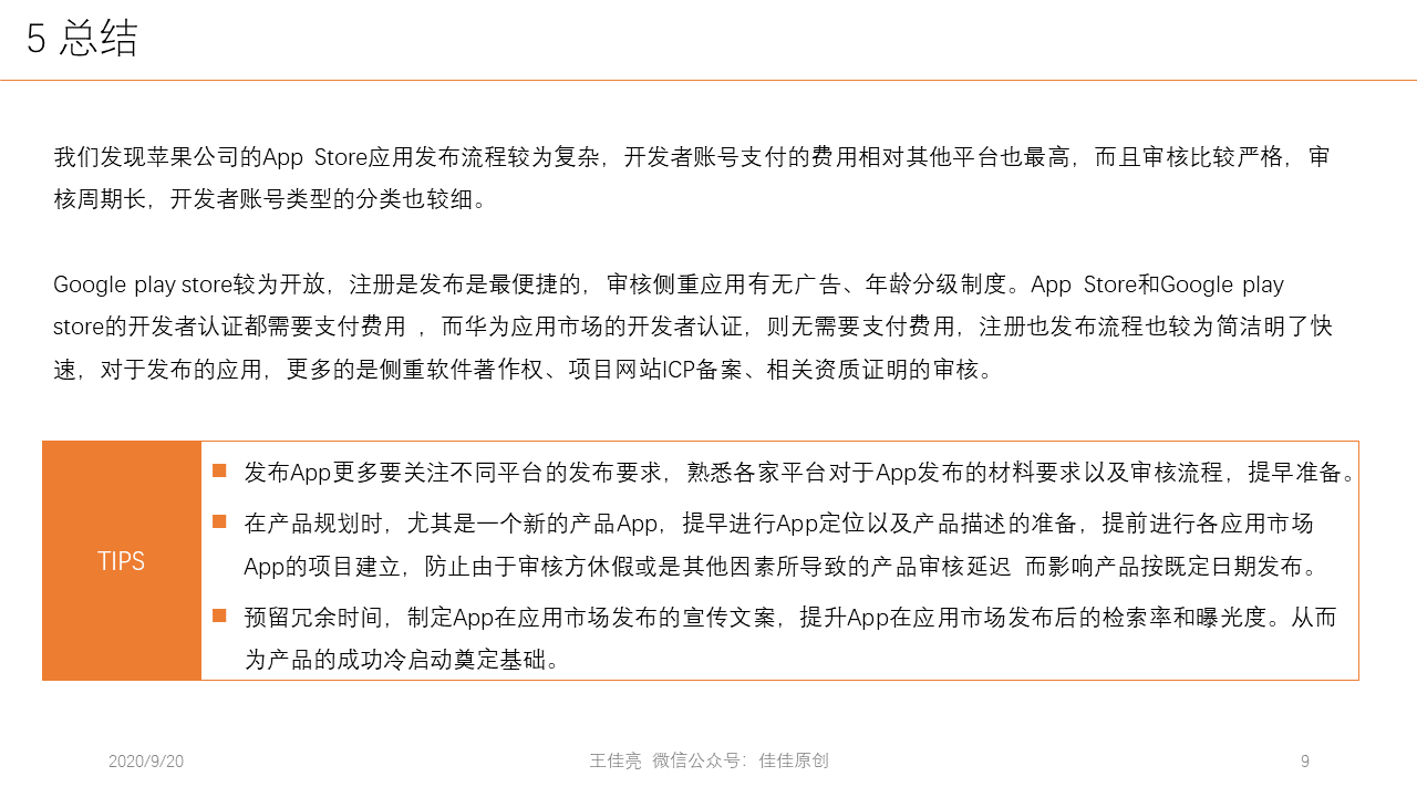 经过实战,我们发现苹果公司的App Store应用发布流程较为复杂,开发者账号支付的费用相对其他平台也最高,而且审核比较严格,审核周期长,开发者账号类型的分类也较细。Google play store较为开放,注册是发布是最便捷的,审核侧重应用有无广告、年龄分级制度。App Store和Google play store的开发者认证都需要支付费用 ,而华为应用市场的开发者认证,则无需要支付费用,注册也发布流程也较为简洁明了快速,对于发布的应用,更多的是侧重软件著作权、项目网站ICP备案、相关资质证明的审核。对于产品经理而言,发布App更多要关注不同平台的发布要求,熟悉各家平台对于App发布的材料要求以及审核流程,提早准备,在产品规划时,尤其是一个新的产品App,提早进行App定位以及产品描述的准备,提前进行各应用市场App的项目建立,防止由于审核方休假或是其他因素所导致的产品审核延迟 而影响产品按既定日期发布。预留冗余时间,制定App在应用市场发布的宣传文案,提升App在应用市场发布后的检索率和曝光度。从而为产品的成功冷启动奠定基础。附录:PPT文档展示