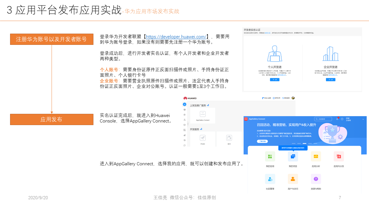登录华为开发者联盟【https://developer.huawei.com/】,需要用到华为账号登录,如果没有则需要先注册一个华为账号,登录成功后,进行开发者实名认证,有个人开发者和企业开发者两种类型。个人账号需要身份证原件正反面扫描件或照片、手持身份证正面照片、个人银行卡号,企业账号需要营业执照原件扫描件或照片、法定代表人手持身份证正反面照片、企业对公账号。认证一般需要1至3个工作日。