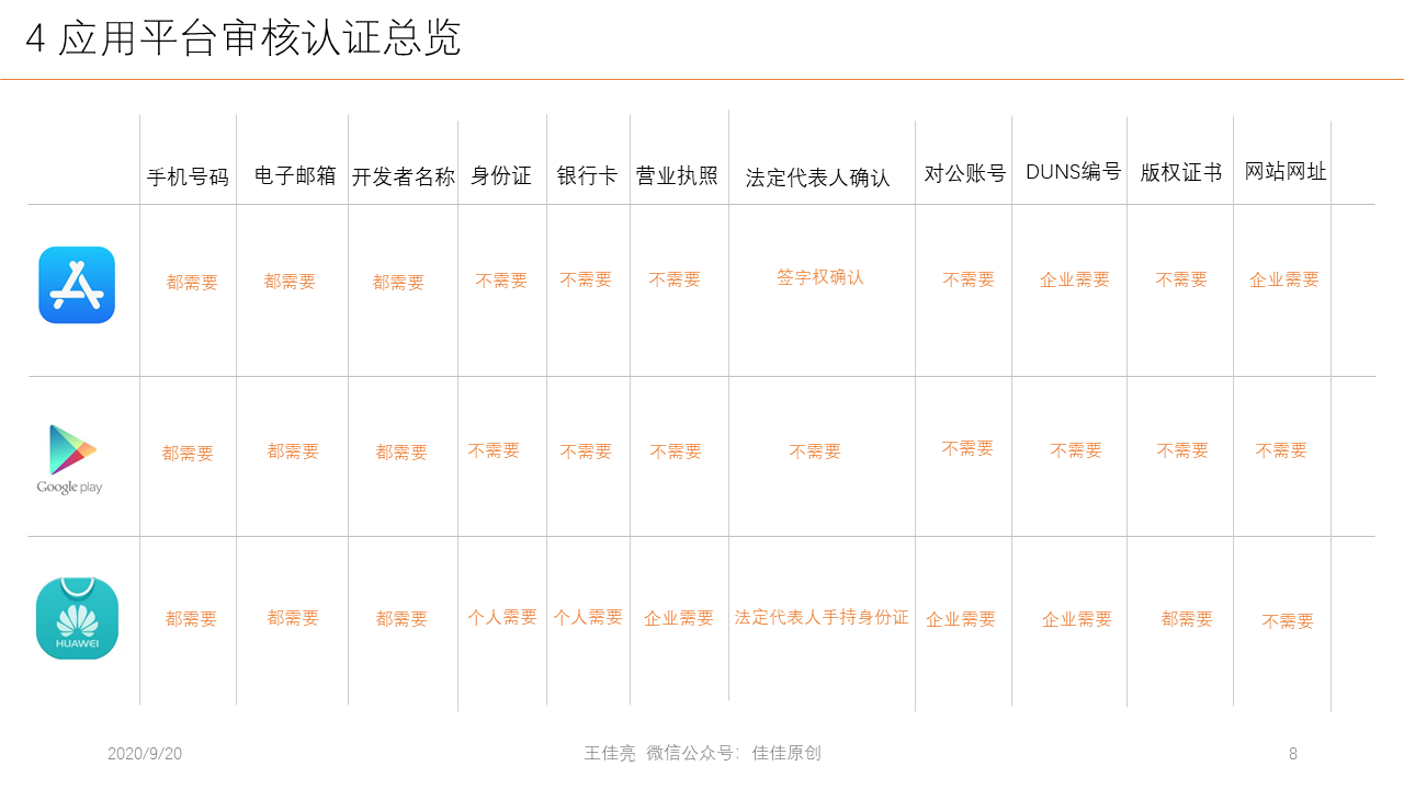 上文中对应用平台发布应用进行了实战操作,相信各位产品经理已经对应用平台发布应用有了直观的认识。本章节对App Store、Google play store和华为应用市场发布应用所需要的审核材料做一个总览。