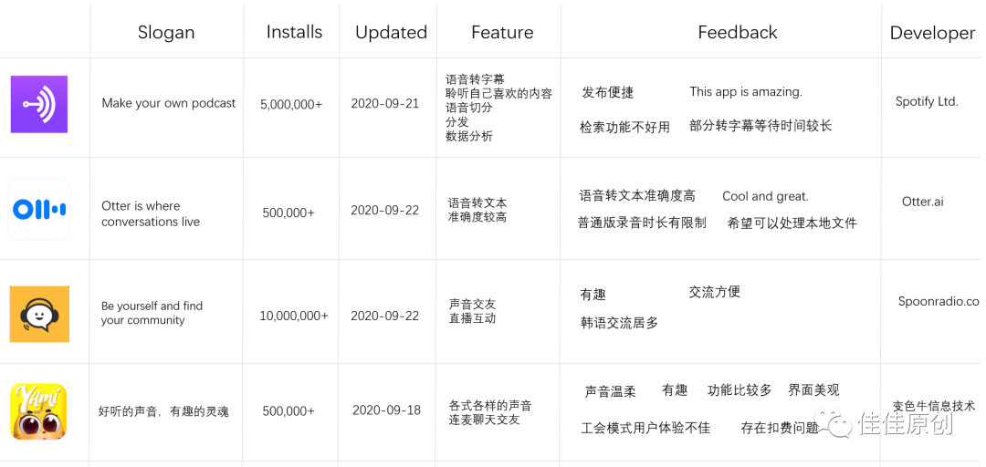 (1)Anchor“Anchor”是一款个人语音广播软件,可以将语音转换为以视频方式展现的流动文字,以便于适应某些不方便播放声音的场景,另外也可以在 Instagram 与 Facebook 等平台上分享,非常有意思。同时“Anchor“这款应用的用户体验细节做的不错,例如只要把耳朵靠近听筒随即开始收音,使用手机录音的方法就像是讲电话一样,非常简单易用。之后也可以无缝地上传云端并于该平台播送,非常便捷。(2)Otter Voice Meeting Note“Otter Voice Meeting Note”其实更像是一款工具软件,可以简单理解为语音笔记。通过NLP技术,可以实时将语音转换为文本,适用于会议和谈话场景,方便记录一些会议或是谈话内容,支持搜索以及与团队进行内容共享。根据用户反馈信息来看,此款软件最受用户认可的功能点在于其语音转文本的准确率很高。(3)Spoon“Spoon”是一款基于语音的专为喜欢社交,想要结识新朋友的朋友提供一个平台,通过音声结交朋友。产品核心卖点是“有趣”,在该平台上有很多的社交趣味资讯,例如情感交流,陪伴游戏,卡拉OK,广播电台,饮食课程等各种有趣的信息。同时为用户提供非常有趣而且丰富的话题,通过与游戏的结合,找到对应的玩伴。(4)Yami”Yami“这款应用专注于语音互动,主打连麦聊天交友,同时最大的特点是有各式各样的声音方便用户进行自由的选择。功能上比较综合,基于语音核心功能,提供语音直播、多人聊天室、语音交友功能,并通过社区动态版块增加产品的趣味性,满足用户好奇心,提升产品用户活跃度。3.2 竞品矩阵