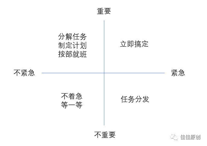 产品经理面对每天繁杂的工作内容,需要对自己的工作做长期和短期的规划。对于长期的产品规划,可以通过WBS(Work Breakdown Structure,工作分解结构)以及里程碑的方式确定,更长远的根据公司战略和产品RoadMap进行规划;而对于近期事情的计划,可以采用事情分类的四象限法则进行排序。如下图所示: